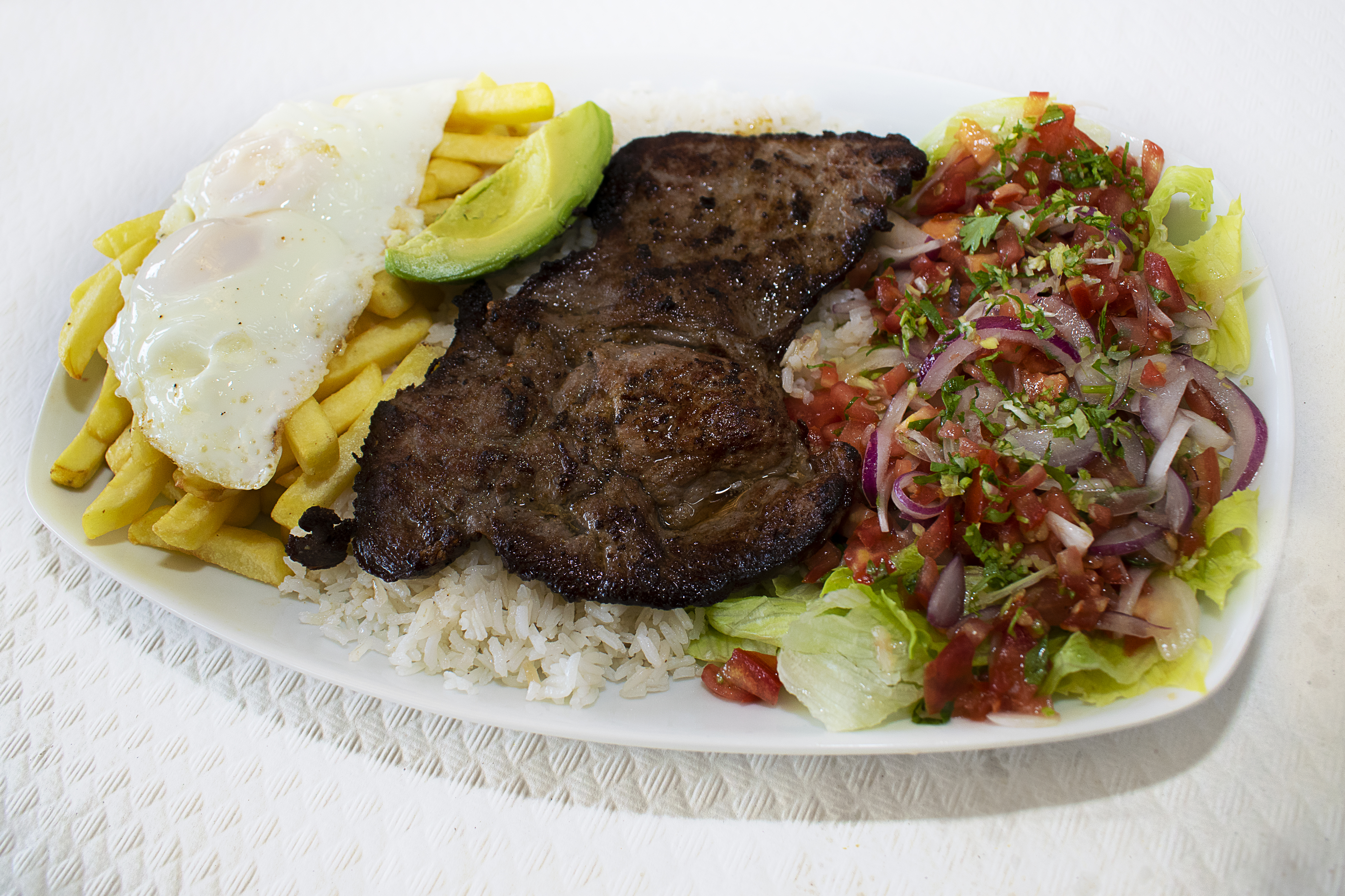 El churrasco ecuatoriano es un bistec grande de carne de res que va acompañado de arroz, papas fritas, huevos fritos, ensalada con encurtido y aguacate. En fin, una contundente delicia para aquellos que necesitan comer en grandes cantidades.